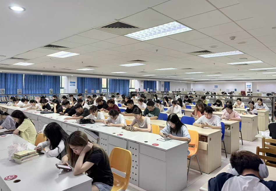 清晨七点半的图书馆自习室里座无虚席,同学们端坐桌前、聚精会神:有的默背单词,测试词汇;有的戴上耳机,练习听力;有的阅读晨报,分析语法,营造出“乐学、勤学、会学”的学习氛围。